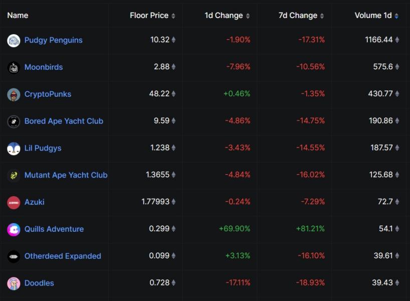 Stats from decentralized finance aggregator DefiLlama indicated that leading projects had their floor prices drop by double digits over the past week. Blue-chip NFT projects such as Pudgy Penguins, Bored Ape Yacht Club (BAYC) and Doodles were some of the worst affected.